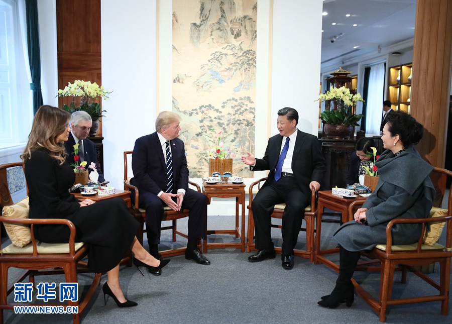 习近平和夫人彭丽媛陪同特朗普和夫人梅拉尼娅参观故宫博物院,两国元首夫妇在故宫宝蕴楼茶叙,共同参观故宫前三殿,在恢宏庄重的太和殿广场合影,观看文物修复技艺展示和珍品文物展,欣赏京剧表演……