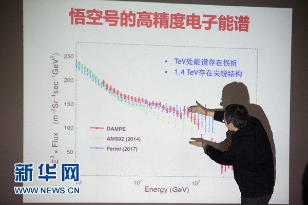 “悟空”首席科学家、中科院紫金山天文台副台长常进介绍,电子宇宙射线的正常能谱变化应该是一条平滑曲线,但根据“悟空”观测数据,在1.4万亿电子伏特(TeV)的超高能谱段突然出现剧烈波动,呈现一个“尖峰”。这表明,此处必然有一个全新的物理现象。