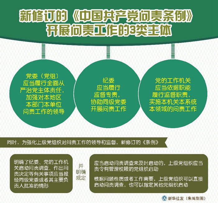 对“谁来问责”,即问责主体方面,新修订的《条例》对开展问责工作的3类主体的职责规定得更加明确具体: