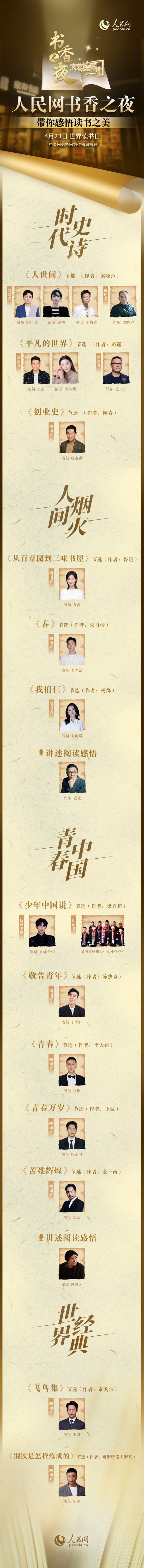 读书可以让人保持思想活力,让人得到智慧启发,让人滋养浩然之气。4月23日是第二十七个世界读书日,由中央网信办网络传播局指导,人民网“文艺星开讲”推出特别策划——书香之夜,邀请雷佳音、易烊千玺、王凯、秦海璐、万茜、胡军、韩东君、王雷、李小萌等文艺工作者,以及作家冯骥才、梁晓声、麦家一起诵读文学经典,讲述阅读故事,从书本中感悟读书之美。4月23日20点,一起读经典!