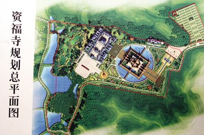 资福寺重建项目筹建办有关负责人介绍,资福寺规划占地150亩,总体布局自西向东可概括为“一线、一圆、一片”。“一线”即从北往南为:寺庙-山门广场-虹桥-佛坛;“一圆”即以佛教艺术博物馆为圆心,其西有静思园,其北有东坡阁、接待中心,其东有药师典故雕塑墙、入口广场、修行桥、琉璃照壁,其南有宝瓶广场、奇石苑。同时四周还散布着许多园林小品;“一片”即为停车区、换乘区及员工生活区。