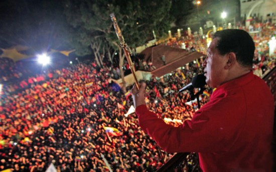 2012年10月7日,在得知自己成功当选总统后,查韦斯面对支持者们举起了玻利瓦尔之剑