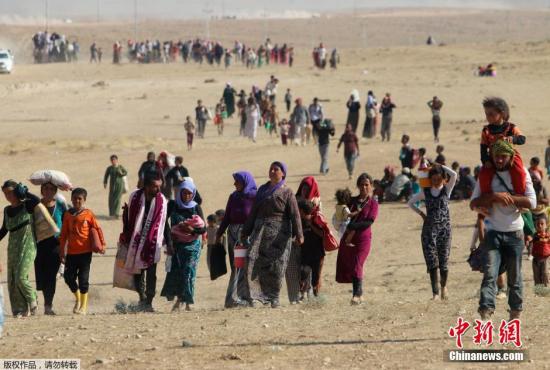 当地时间2014年8月12日,伊拉克与叙利亚边境,大量流离失所的伊拉克民众逃离战区。
