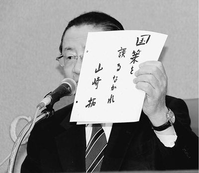 记者会结束之前,山崎手持亲笔所写的“莫误国策”,意味深长地呼吁道,“当前日本安保政策面临巨大转折,若放弃和平发展,日本成为可以行使武力的国家,这是将国策引向错误方向的做法”。分析人士认为,山崎用“莫误国策”来告诫日本政府不要重蹈覆辙,提醒爱好和平的人民对日本政府的做法提高警惕。
