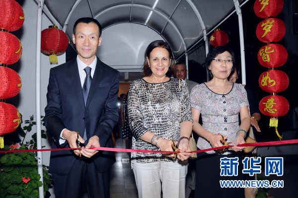 刘波(左)、突尼斯文化部长拉克达尔(中)、中国驻突尼斯大使边燕花为展览剪彩。新华社发(阿代尔摄)