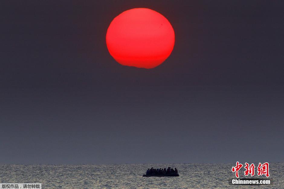 当地时间8月11日,位于土耳其与希腊之间的爱情海海域,一艘载满叙利亚偷渡者的船只漂浮在海面,一轮巨大的落日高悬在他们头上,更加凸显悲凉。