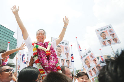 图片说明:1日,新加坡,总理李显龙提交提名文件,支持者集会。新加坡议会选举即将举行,候选人1日提交提名文件。CFP