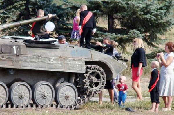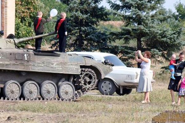 在乌克兰顿涅茨克的一所小学开学的第一天,新入学的小男孩显然有些紧张。但是任何紧张的情绪在他坐着坦克来到学校之后都烟消云散了。