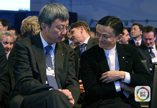 今年1月21日,国际货币基金组织副总裁朱民(左)与阿里巴巴集团董事局主席马云(右)出席达沃斯论坛年会。(新华社记者罗欢欢摄)