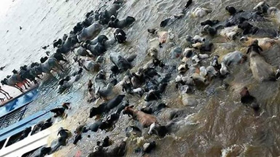 巴西一运牛船倾覆,所载5000头牛多数溺亡。(网页截图)