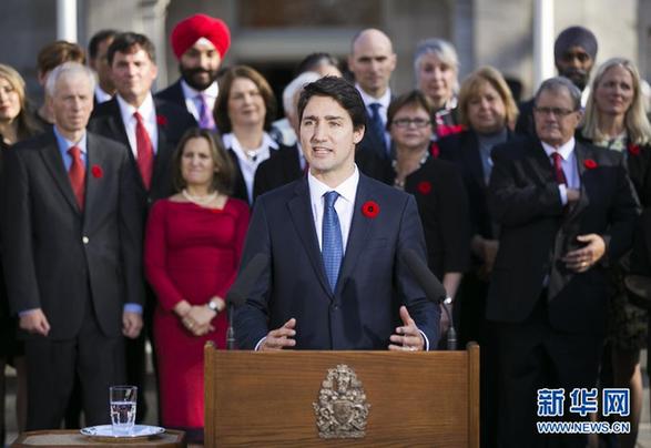 11月4日,在加拿大渥太华,加拿大当选总理特鲁多(前)在就职仪式后发表讲话。加拿大当选总理贾斯廷·特鲁多当日在渥太华宣誓就职,加拿大总督约翰斯顿主持就职仪式。 新华社发(克里斯·卢萨基斯摄)