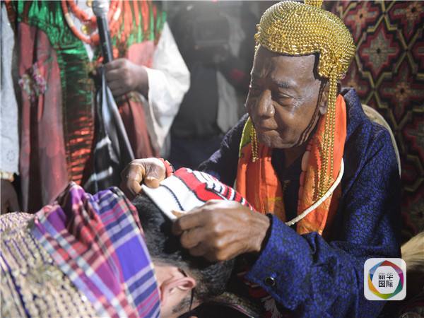 图为被授予“酋长”头衔的刘金泉(右)。