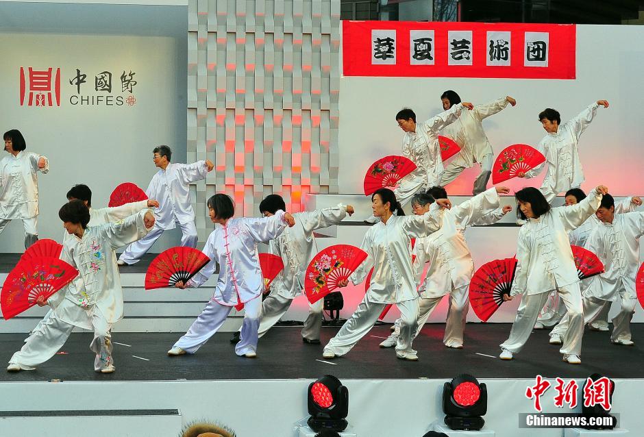 1月30日,众多华侨华人前往日本东京市中心的地标建筑六本木大厦,参加在此举办的“2016中国节”活动,感受家乡“年味”的热情。图为在日侨胞艺术团体登台演绎太极扇。中新社记者 王健 摄