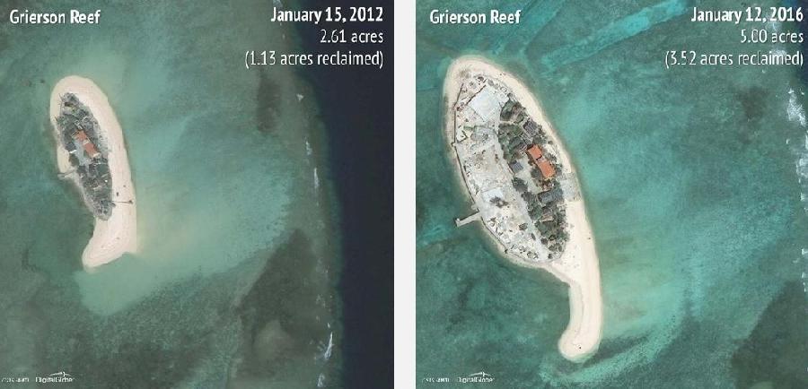 越南在染青沙洲非法填海造岛前后对比图。染青沙洲位于北纬9度54分,东经114度34分。是牛轭礁西南5海里的个小沙洲,距染青东礁0.9海里,西北距东门礁5海里,西南距赤瓜礁21海里,面积0.12平方千米。1978年起为越南占领,建有较完善的设施。
