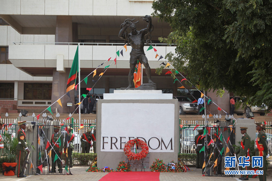 5月25日,在赞比亚首都卢萨卡,士兵在非洲解放日纪念活动中守卫自由雕像。当天,赞比亚在首都卢萨卡举行盛大活动,纪念非洲解放日。每年的5月25日是非洲解放日,它是非洲人民团结反帝反殖,捍卫国家主权和独立,争取民族解放斗争的纪念日。新华社记者彭立军 摄
