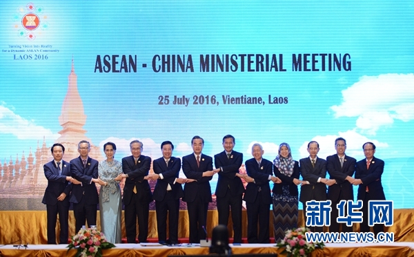 7月25日,在老挝首都万象,中国外交部长王毅(左六)和与会代表在会议开始前合影。当日,中国-东盟(10+1)外长会议在老挝首都万象举行。 新华社记者 刘昀 摄