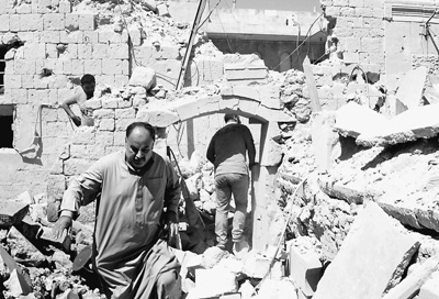 8月15日,叙利亚阿勒颇反对派控制地区遭到空袭。图为当地居民在空袭过后的废墟中寻找家中物品。