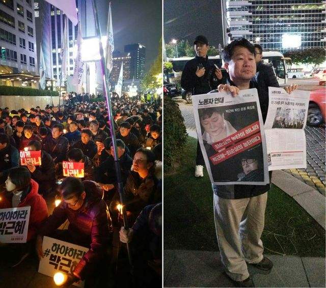 3日晚7时左右,大约千人聚集在离青瓦台不过十几分钟车程的光化门广场,手捧烛火,举起标语,要求朴槿惠下台。