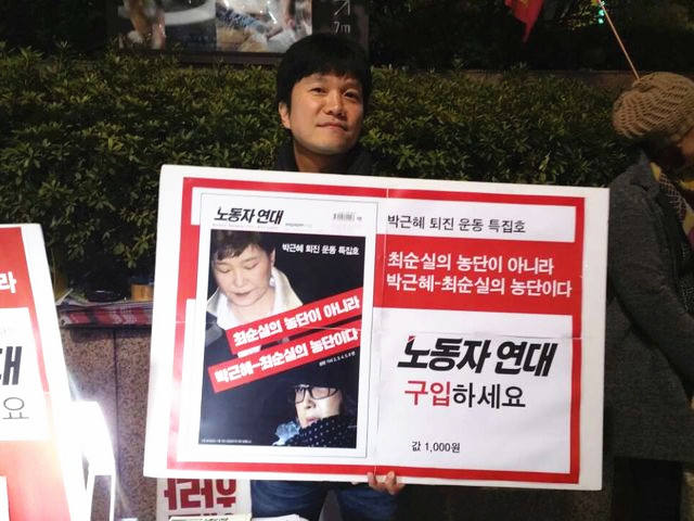 特别之处在于,在这个漆黑的夜晚,示威的人们情绪并非全然低落。有些示威者在高举“朴槿惠下台”标语的同时却脸露微笑。集会中,激愤的发言间歇,竟播放旋律欢快的歌曲。