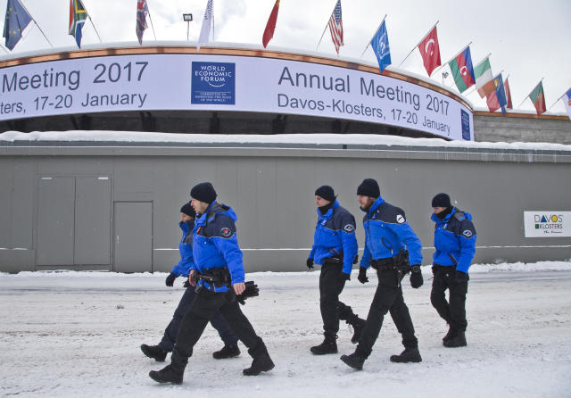 1月15日,在瑞士达沃斯,警察走过即将举办世界经济论坛年会的会议中心。(新华/美联)