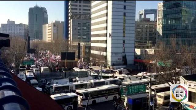 10日,韩国宪法法院外,警方严阵以待,采取出入管制。警方大巴车围成车墙。