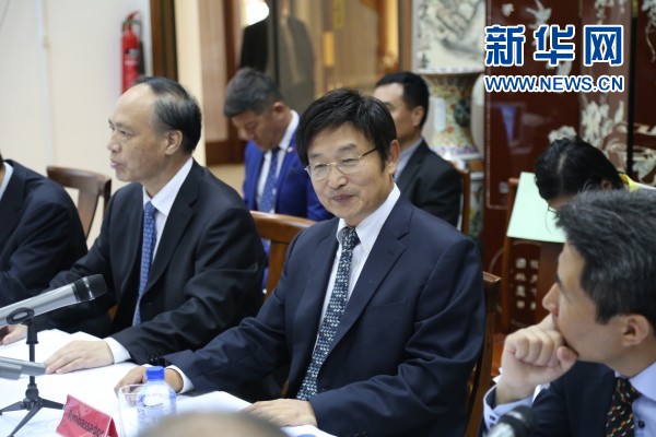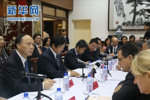 中国驻塞浦路斯大使黄星原(中)。新华网记者 张章 摄