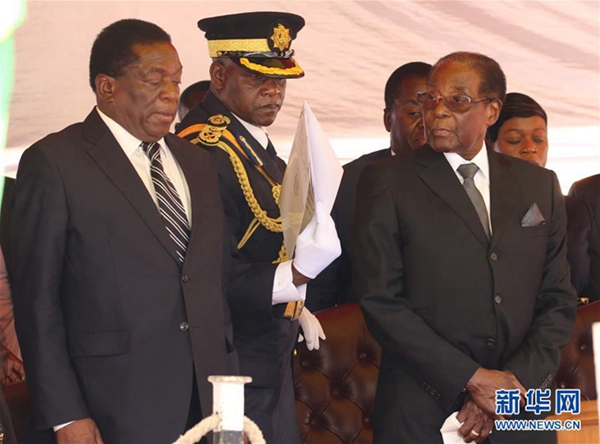 这是11月1日在津巴布韦首都哈拉雷拍摄的穆加贝(前右)和姆南加古瓦(前左)出席活动的资料照片。新华社发(费列蒙 摄)