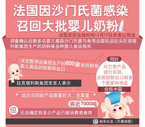 新华社巴黎12月11日电(记者 张雪飞)法国政府10日发表公报说,调查确认近期多名婴儿感染沙门氏菌与食用法国乳品巨头拉克塔利斯集团生产的奶粉等多种婴儿食品相关,决定暂停该集团生产的600余批奶粉等婴儿食品的销售和出口,同时对已售产品进行召回。这些奶粉出口到多个国家和地区,包括中国。