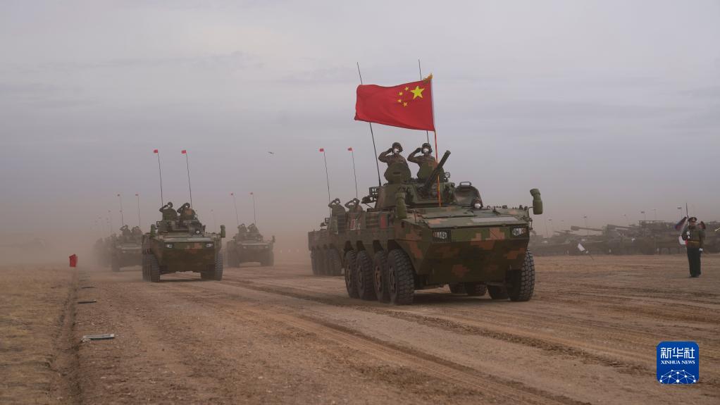 滚滚硝烟中,漫天黄沙里,来自上合组织成员国的一台台步战车、突击车等轮式装甲装备雷霆出击,相继展开战斗队形向“恐怖武装”前沿发起猛烈攻击。