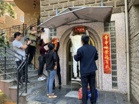 春节前夕,国网中电装备公司的中国员工和埃塞俄比亚同事在工程项目部一起贴春联,共同迎接中国春节。