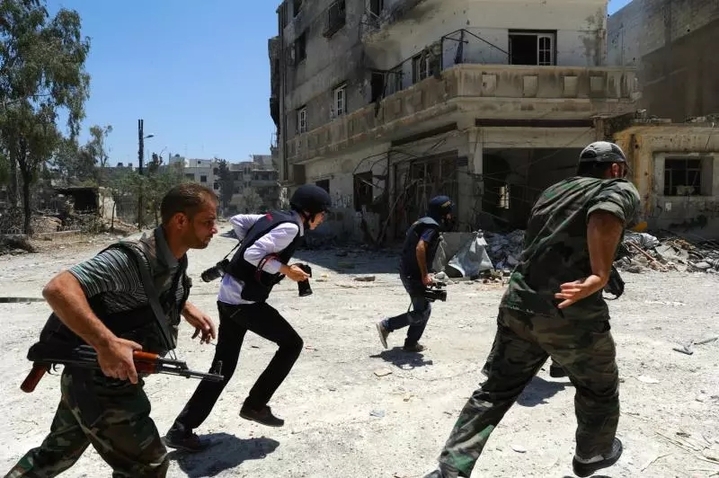 2013年8月,人民日报社记者在处于战火中的叙利亚霍姆斯老城采访。