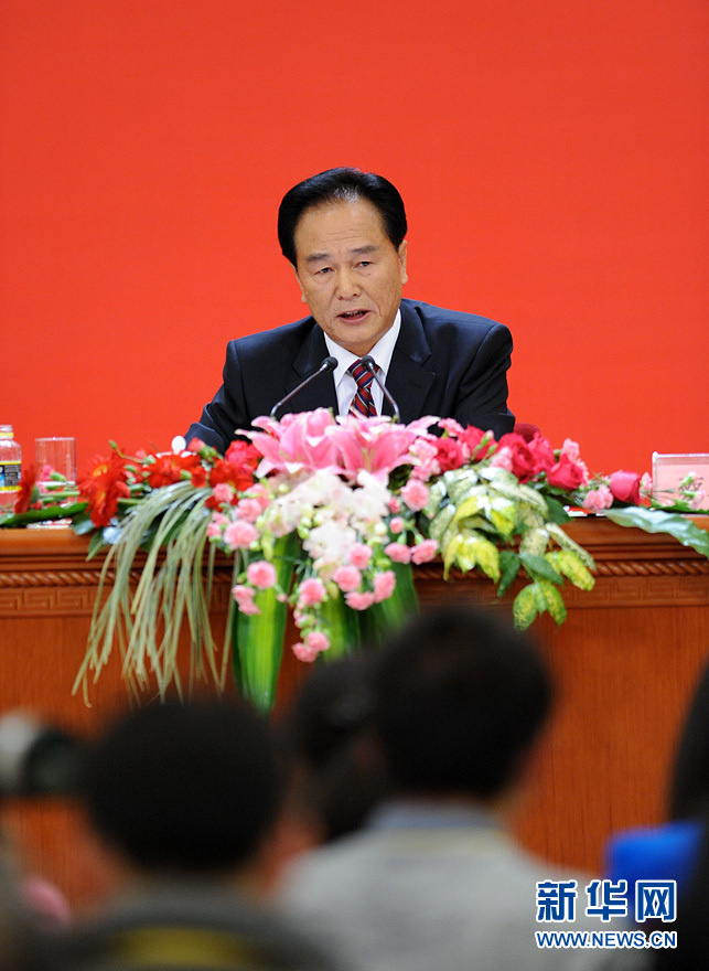 2012年11月7日16:30,中国共产党第十八次全国代表大会新闻发言人在人民大会堂三楼金色大厅举行新闻发布会。图为中国共产党第十八次全国代表大会新闻发言人蔡名照。新华网 陈竞超 摄