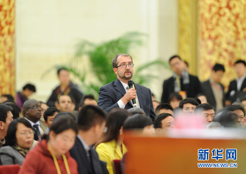 2012年11月7日16:30,中国共产党第十八次全国代表大会新闻发言人在人民大会堂三楼金色大厅举行新闻发布会。图为俄罗斯新闻社记者提问。新华网 陈竞超 摄