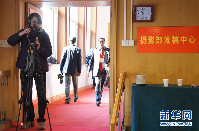 8日中午快十一点,一名外国记者来到位于人民大会堂的新华社十八大报道中心拍摄。新华网记者 姚斯彦摄