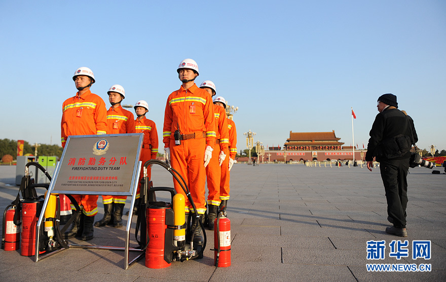 11月8日,中国共产党第十八次全国代表大会在北京人民大会堂开幕。图为当天在大会堂外值勤的消防官兵。新华网 陈竞超 摄