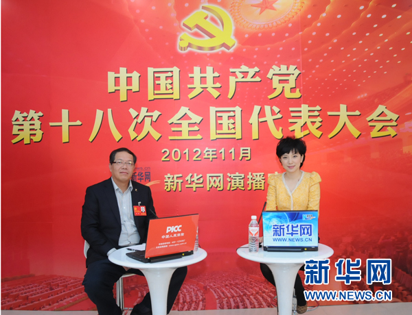 2012年11月10日13:00,广西柳州市委书记陈刚做客新华网。图为陈刚与主持人刘燕合影。新华网 康薇 摄