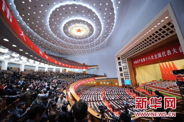 11月14日,中国共产党第十八次全国代表大会闭幕会在北京人民大会堂举行。 这是大会会场。 新华社记者 陈建力 摄