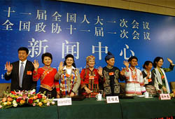 2008年3月10日16时15分,八位出席十一届全国人大一次会议的少数民族代表在大会新闻中心(梅地亚宾馆多功能厅)接受中外记者集体采访。