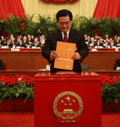 十一届全国人大代表15日上午以无记名投票方式,选举胡锦涛为中华人民共和国主席、中华人民共和国中央军事委员会主席,选举吴邦国为第十一届全国人民代表大会常务委员会委员长,选举习近平为中华人民共和国副主席。