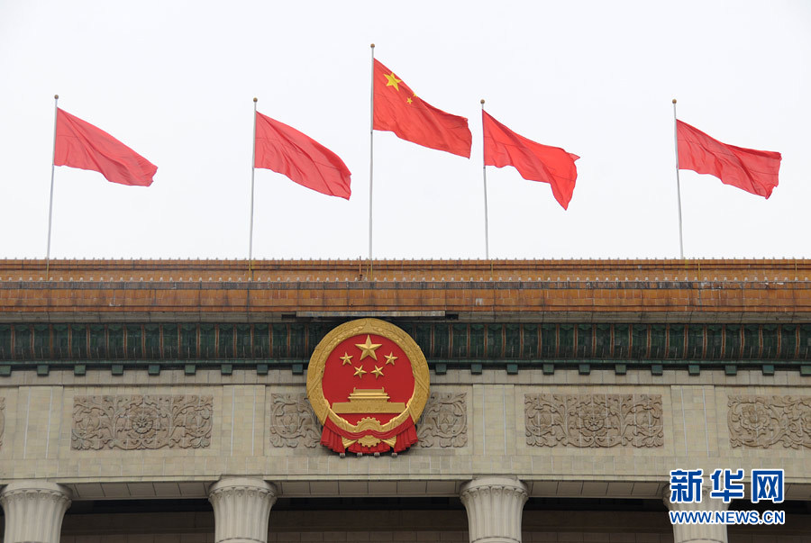 3月2日,人民大会堂上方布置的红旗迎风飘扬,喜迎2013年全国两会的召开。新华网 翟子赫摄