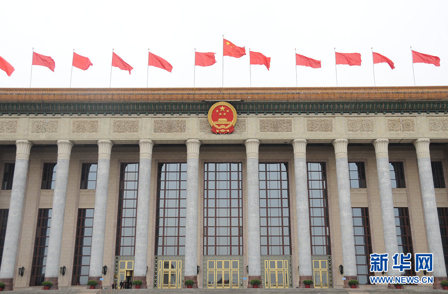 人民大会堂红旗飘扬喜迎两会