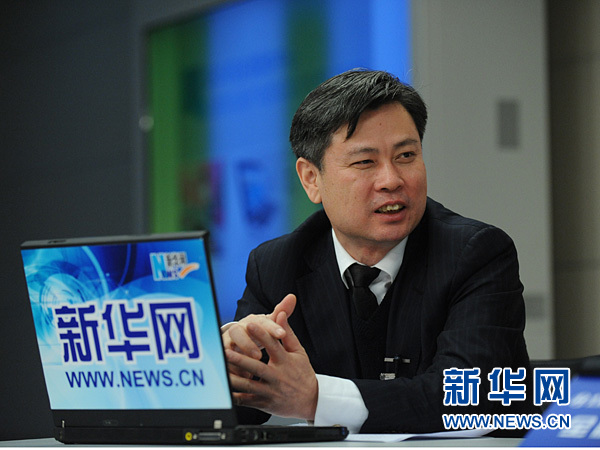 2013年3月3日,全国政协委员袁隆平、袁隆平农业高科技股份有限公司董事长伍跃时做客新华网两会访谈。图为伍跃时在访谈现场。新华网 陈竞超 摄