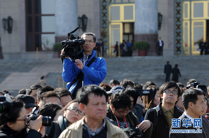 2013年3月3日下午3时,全国政协十二届一次会议在人民大会堂举行开幕会,听取政协全国委员会常务委员会工作报告,听取政协全国委员会常务委员会关于提案工作情况的报告。图为采访“两会”的摄影记者。新华网/中国政府网 陈竞超 摄