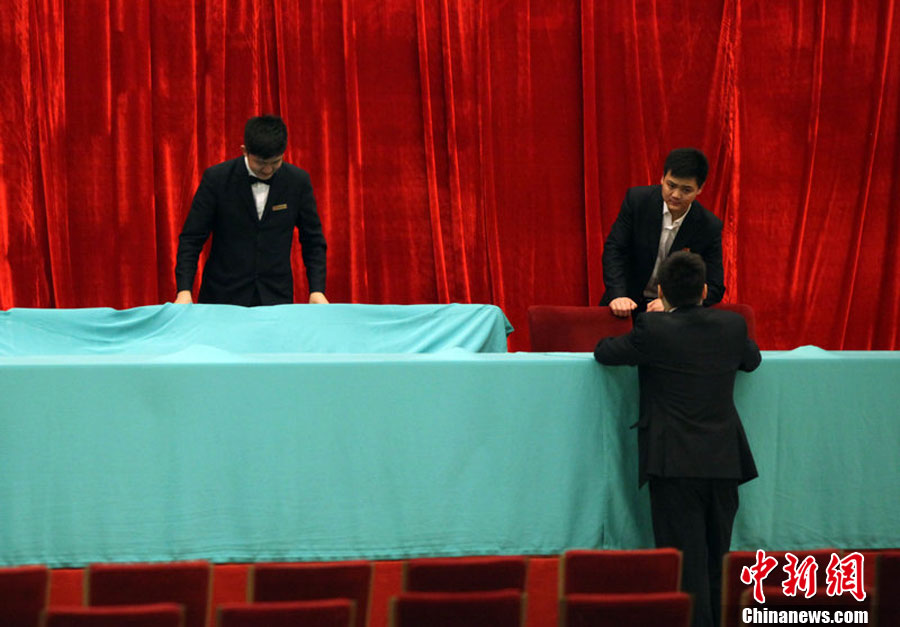 3月1日,北京,人民大会堂内,工作人员在布置会场。田贺 摄