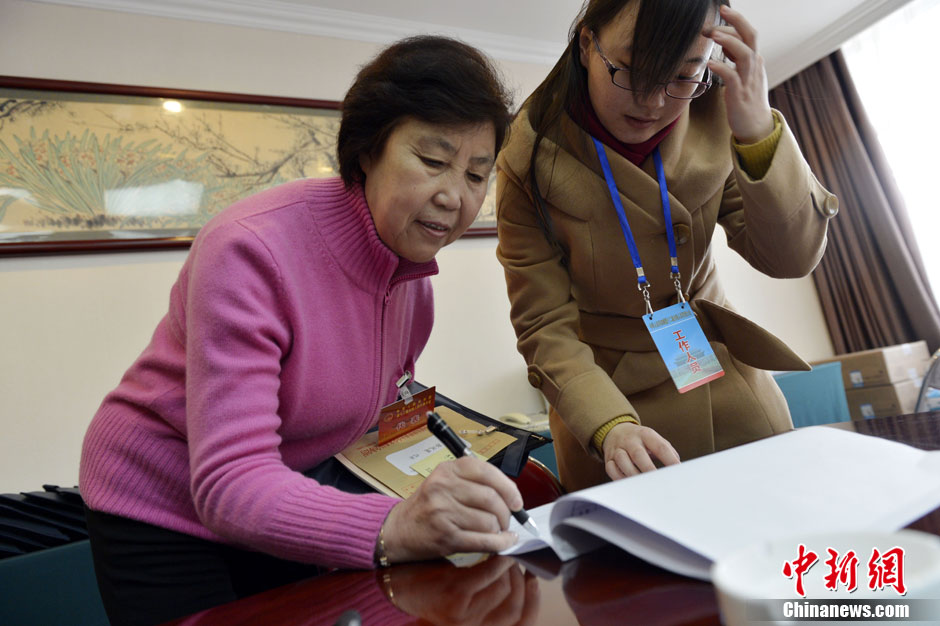 3月2日,参加十二届全国人大一次会议的山西代表团抵达北京。图为“铁姑娘”郭凤莲领取人大代表参会证件。中新社发 韦亮 摄