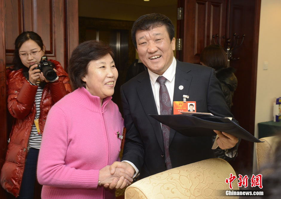 3月2日,全国人大代表郭凤莲(左)、韩长安随全国人大山西代表团抵达驻地,并报到领取代表证。郭凤莲代表曾在山西大寨工作,被称为“铁姑娘”;韩长安代表曾被党中央、国务院、中央军委授予“全国抗震救灾模范”称号。中新社发 侯宇 摄