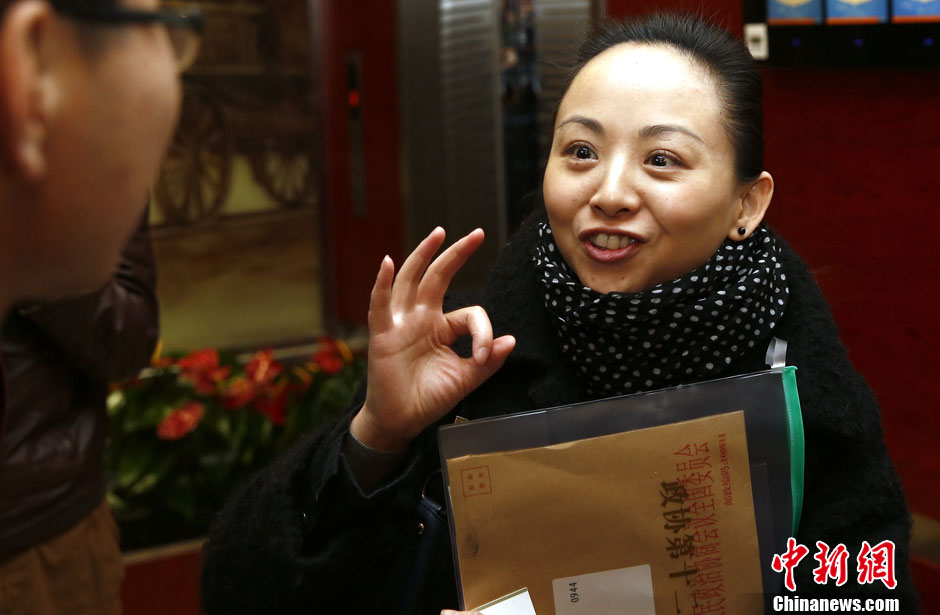 3月2日,全国政协委员、中国残疾人艺术团团长邰丽华在政协委员驻地用手语跟记者交流。她手势的意思是表示可以接受采访,但要等助理来了才行。中新社发 张浩 摄