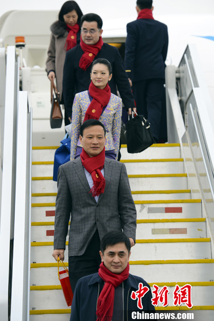 3月2日,参加十二届全国人大一次会议的福建省代表团抵达北京首都机场,代表团成员每人围着一条红色围巾走下飞机。中新社发 刘震 摄