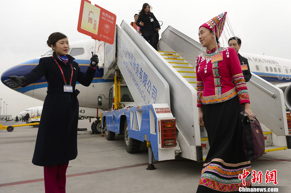 3月2日,参加十二届全国人大一次会议的广西壮族自治区代表团抵达北京首都机场,少数民族代表身着民族服装走下飞机。中新社发 刘震 摄