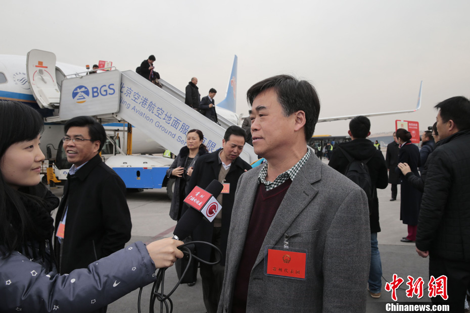 3月2日,参加十二届全国人大一次会议的贵州省代表团抵达北京首都机场,全国人大代表、贵州中电振华信息产业有限公司董事长、党委书记陈中在机场接受记者采访。中新社发 杜洋 摄